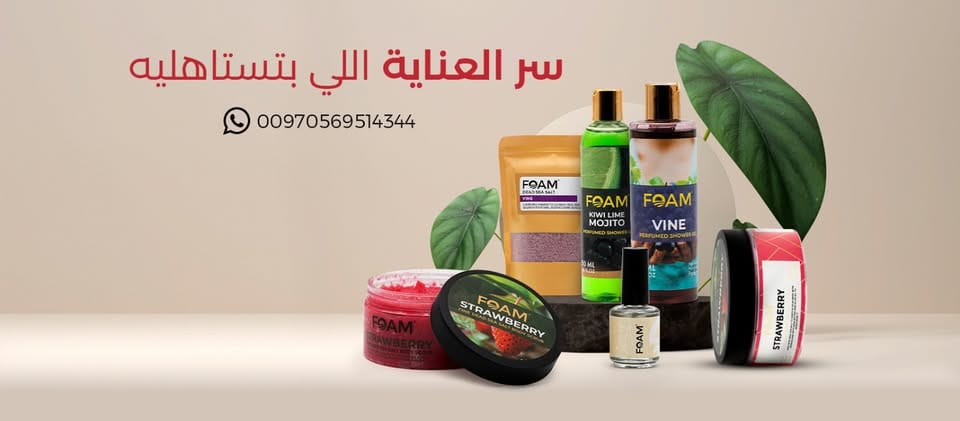 فُوم (FOAM): هي علامتنا التجارية الأساسية والأكثر شهرة، والتي تجمع بين الجودة العالية والسعر المتوسط المناسب.. فُوم هي الخيار المفضل لمن يبحث عن دلال استثنائي وروتين عناية متكامل للجسم والبشرة والاسترخاء بمواصفات ألمانية عالمية وروح فلسطينية أصيلة، ليكون التميز جزءاً من يومكِ.